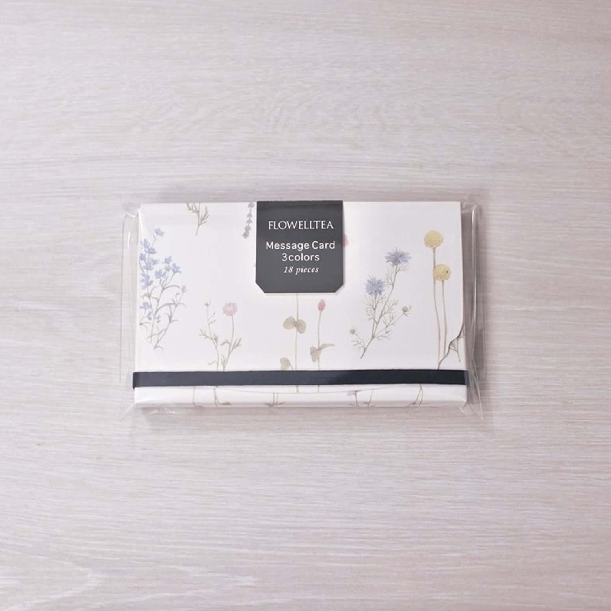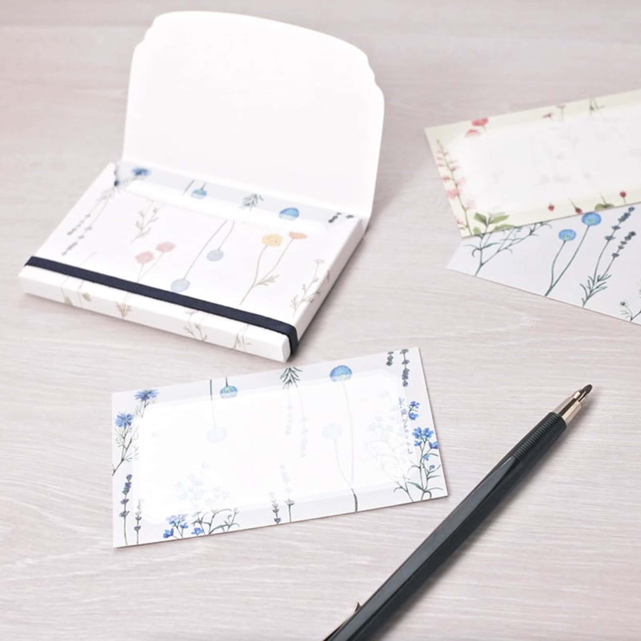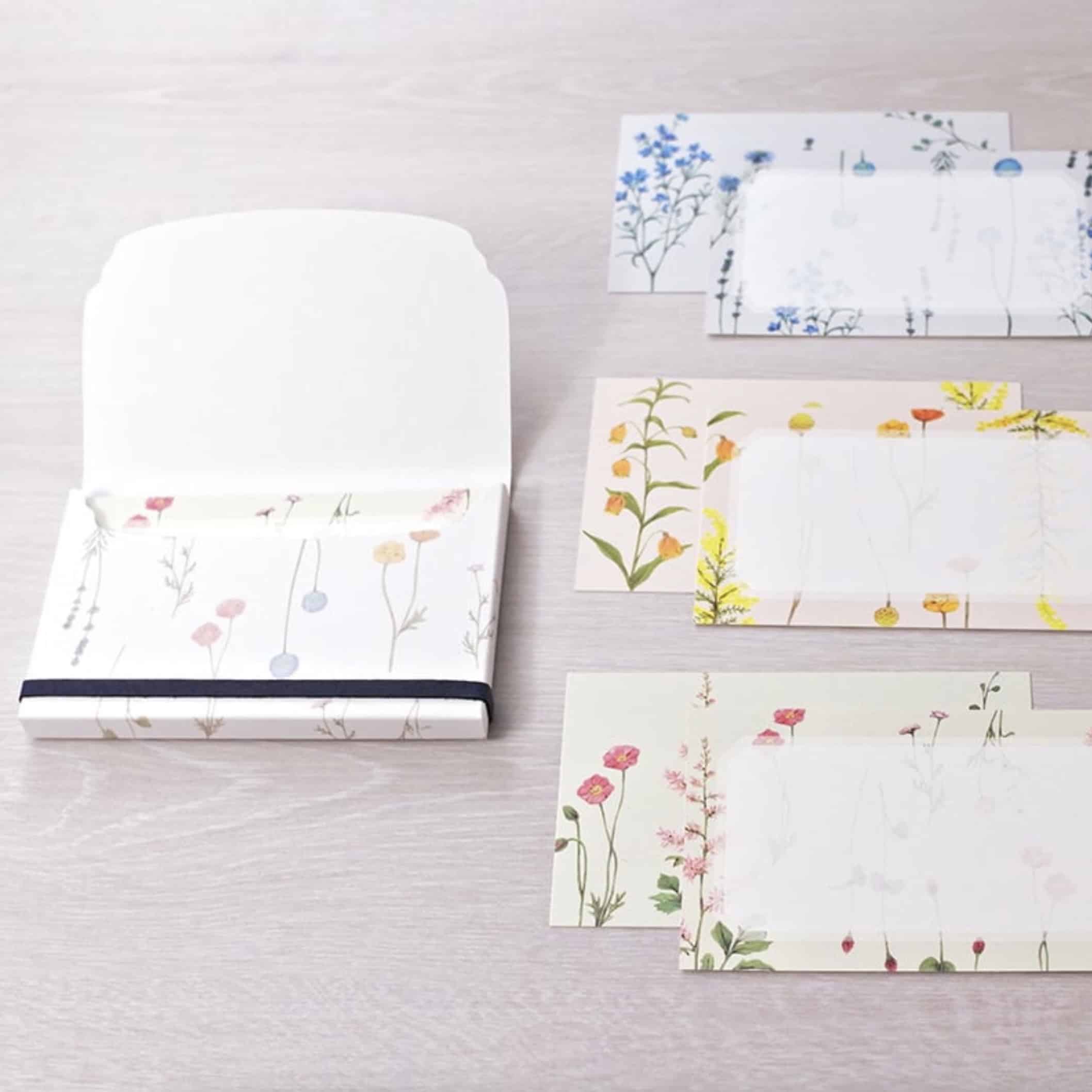 這些卡片以名片大小製作,正反面皆有花卉圖案,並裝在一個紙盒內,搭配皮革繩裝飾。無論是日常留言、商務場合,或在贈禮時添加溫馨問候,都非常適合使用。