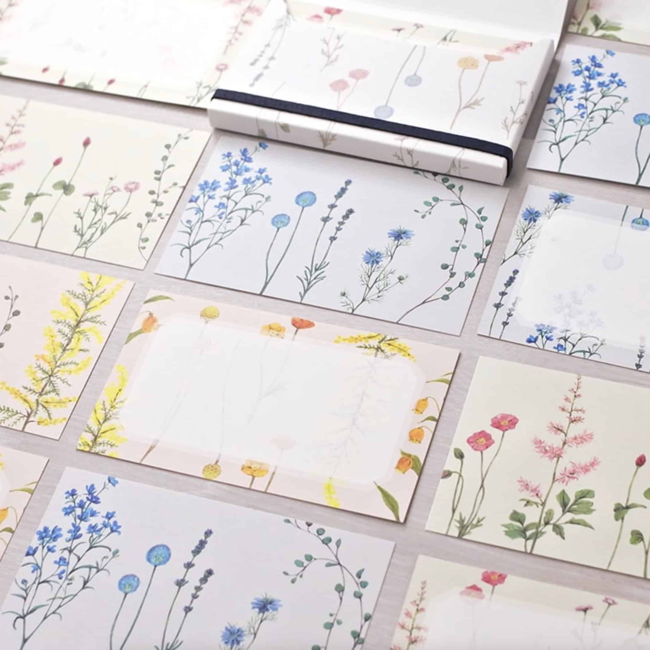 這是一組附有收納盒的小卡片套裝,設計靈感來自於常見的花藝與花束中的花朵,如罌粟花、紅花草、落新婦、雛菊等粉色花朵,薰衣草、翠雀花、愛爾蘭黑種草、風信子等藍色花朵,以及罌粟花、金球花、鈴蘭花、含羞草等黃色花朵。