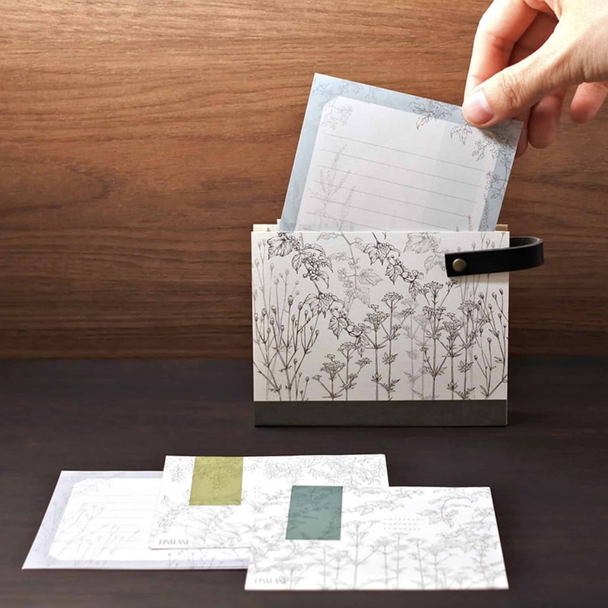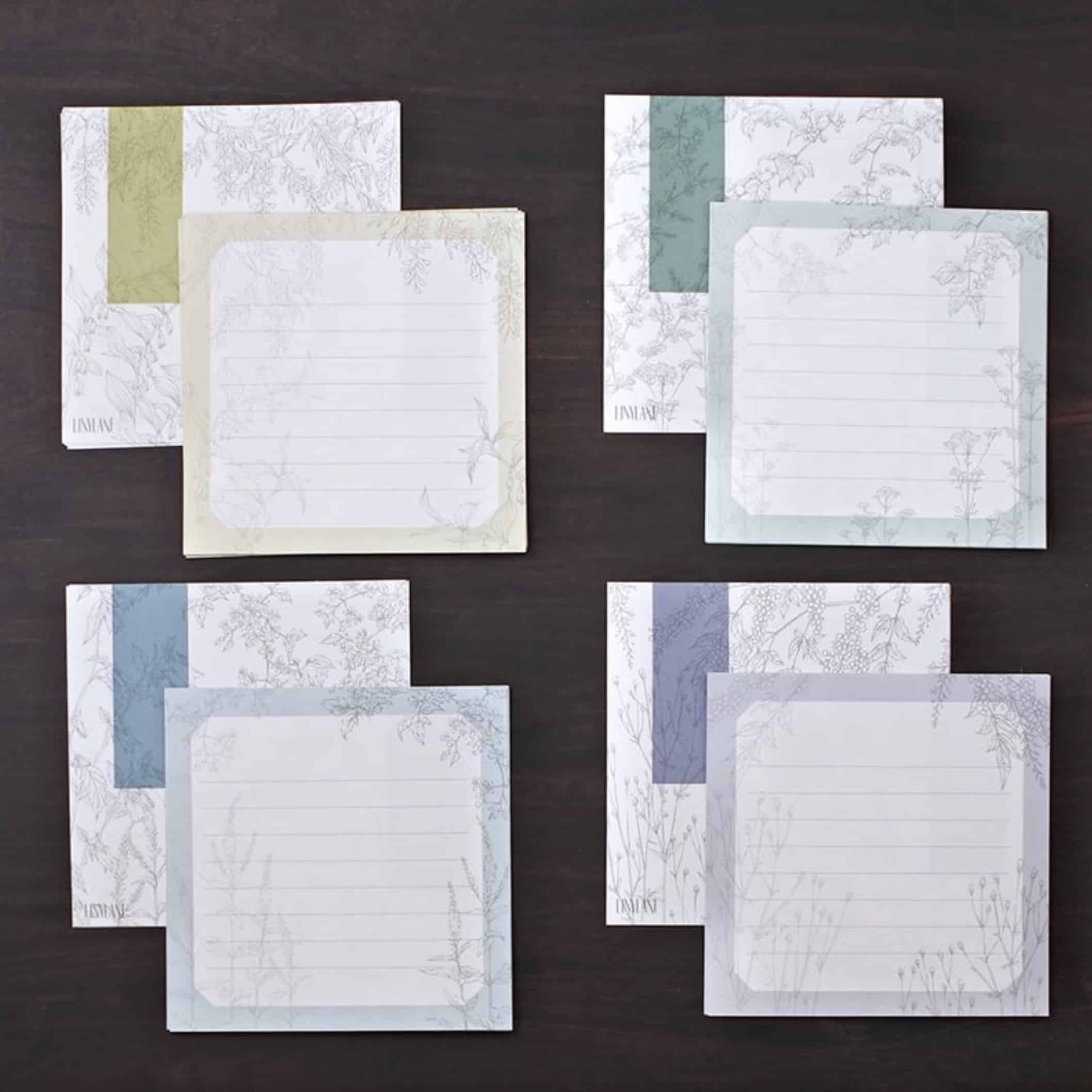 這是一款可愛的小正方形便條紙,為傳達美感的淡雅風格設計,靈感來自於燈籠花、女郎花等不同季節的山野草,背面印有淡淡的橫線、邊框與主題代表物。便條紙共有32張,採用一筆箋的柔和、淡雅色調,適合用於感謝信、慰問卡、邀請函等場合的書寫,以及隨筆或日常筆記,保持簡單而不失優雅。