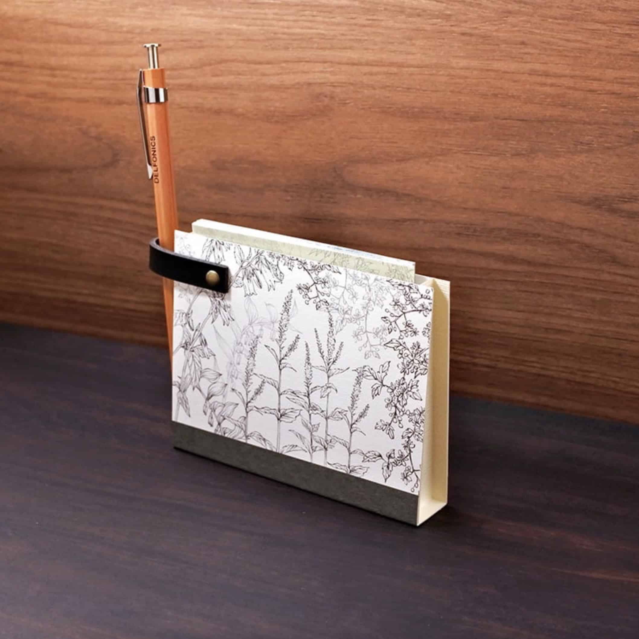 這些便條紙並搭配一個簡約的紙製收納盒,其中一側用金屬釘固定的皮革帶,方便您放置書寫用的筆。由於其穩重的色調,能夠輕鬆融入任何書桌或空間的裝飾。