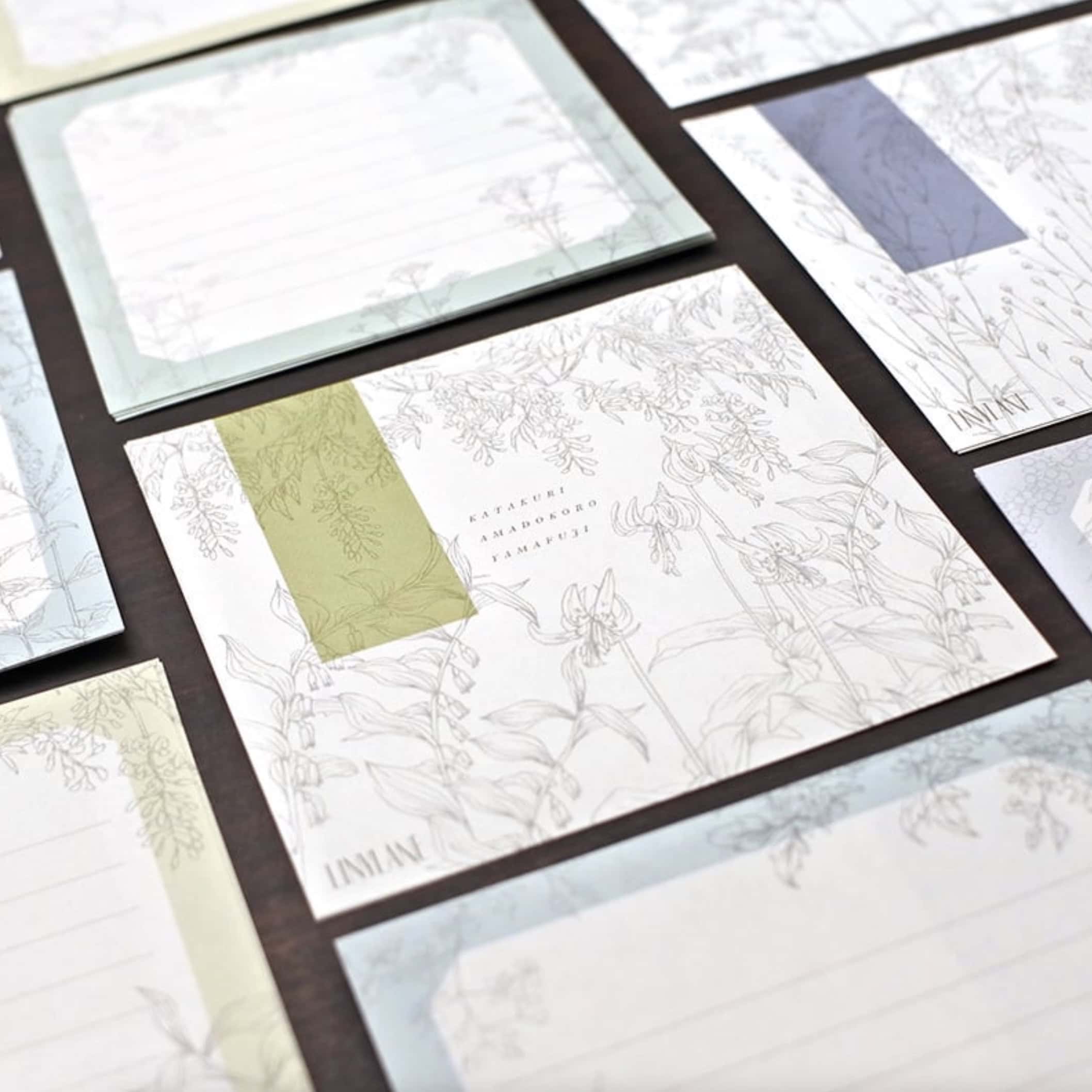 圖案主題包括淡黃褐色(包含片栗、玉竹、山藤等)、水藍色(包含燈籠花、牡丹藤、藍虎尾草等)、草綠色(包含女郎花、野葡萄、山萩等)與紫羅蘭色(包含吾亦紅、野菊、南天等),能為您的書寫體驗增添自然風格。